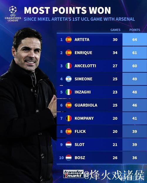 自阿尔特塔执教阿森纳欧冠首秀以来的积分表现