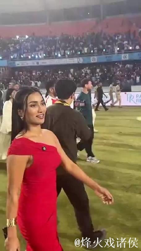 红裙印度女主持携手梅西同游绿茵场